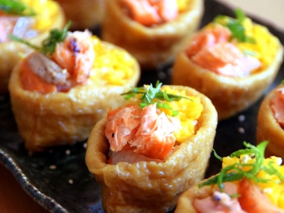 - いなり寿司の皮に散らし寿司を詰め、甘鮭と炒り卵を乗せます。 最後に刻んだ紫蘇とごまをのせて完成です。