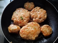 - 熱したフライパンに油をしき、丸く形取ったタネを両面こんがりと焼きます。(今回は子ども用の小さめも焼きました。)