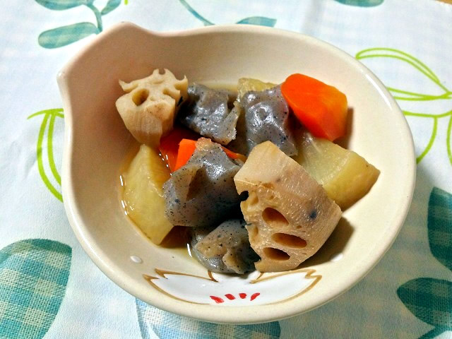 圧力鍋を使って簡単煮物♪こんにゃくのアク抜きも、熱湯に5分~浸けておくだけで十分抜けますので時短になります! お野菜も味がしっかりと染み込んで柔らかくなっていますので、小さなお子様にもオススメです。