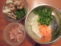 - フライパンに油をしいて、みじん切りした野菜と鶏肉を炒めます。