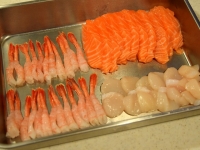- サーモンは刺身の状態に切ります。甘エビは殻がついていたら剥いておきます。 ホタテは開いておきましょう。