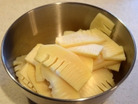 - たけのこは水煮して3mm程度のスライスにします。