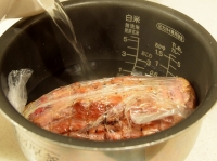 - ポリ袋に入れて空気を抜いて密封し、炊飯器に入れ、豚肉がつかるくらいまで炊飯器に熱湯を注ぎます。
