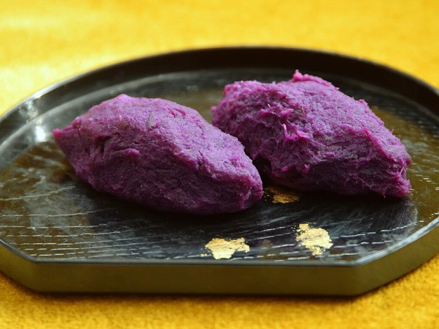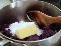 - 紫芋をつぶしながらよく練っていきます。程よい硬さになったら火を止めます。