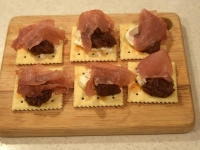 クラッカーにクリームチーズと生ハム、オリーブのペーストを乗せた大人の前菜です。