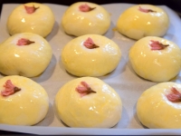 - 発酵したらあんぱんの真ん中に指を入れてくぼみを作ります。照りを出すために溶き卵を塗ります。 くぼみの部分に水気を切った桜をのせて190度のオーブンで20分ほど焼きます。